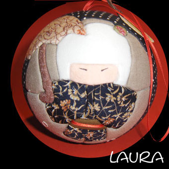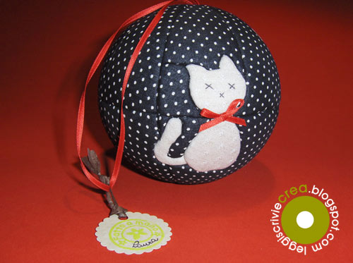 Per questo patchwork su sfera di polistirolo ho scelto uno stile kokeshi raffinato: il connubio bianco e nero fa sempre la sua bella figura.