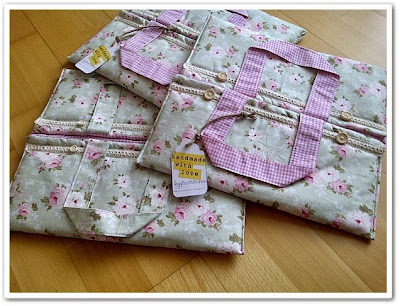 Ho fatto alcuni esperimenti variando il tipo di bottoni e di pizzo per la rifinitura e la stoffa per le maniglie.